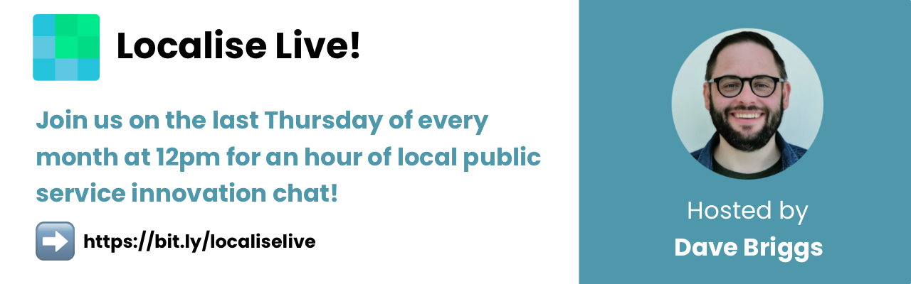Join me for a light-hearted hour of sharing challenges, ideas, and experience about innovating in local public services. Localise Live! takes place on the last Thursday of every month at 12pm until 1pm and is open to public sector people only.…