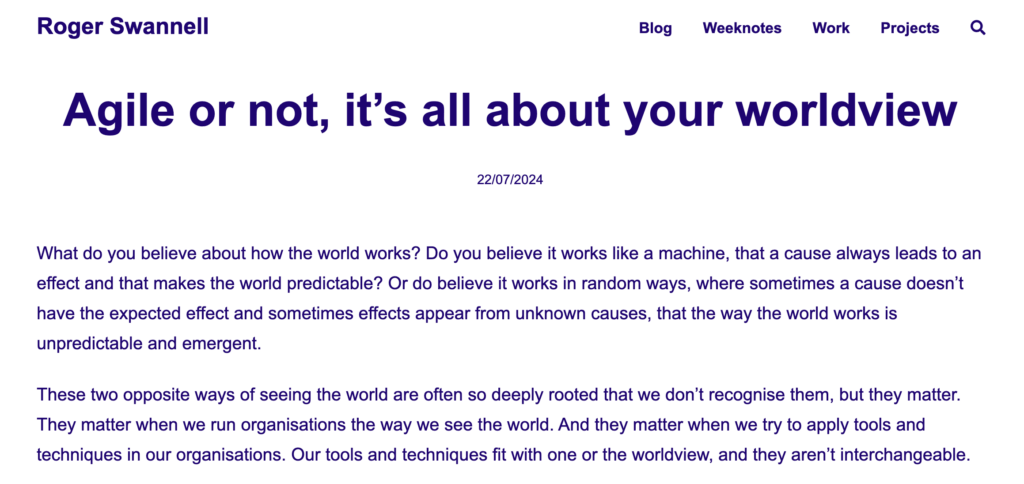“What do you believe about how the world works? Do you believe it works like a machine, that a cause always leads to an effect and that makes the world predictable? Or do believe it works in random ways, where sometimes a cause doesn’t have the expected effect and sometimes effects appear from unknown causes, that the way the world works is unpredictable and emergent.”