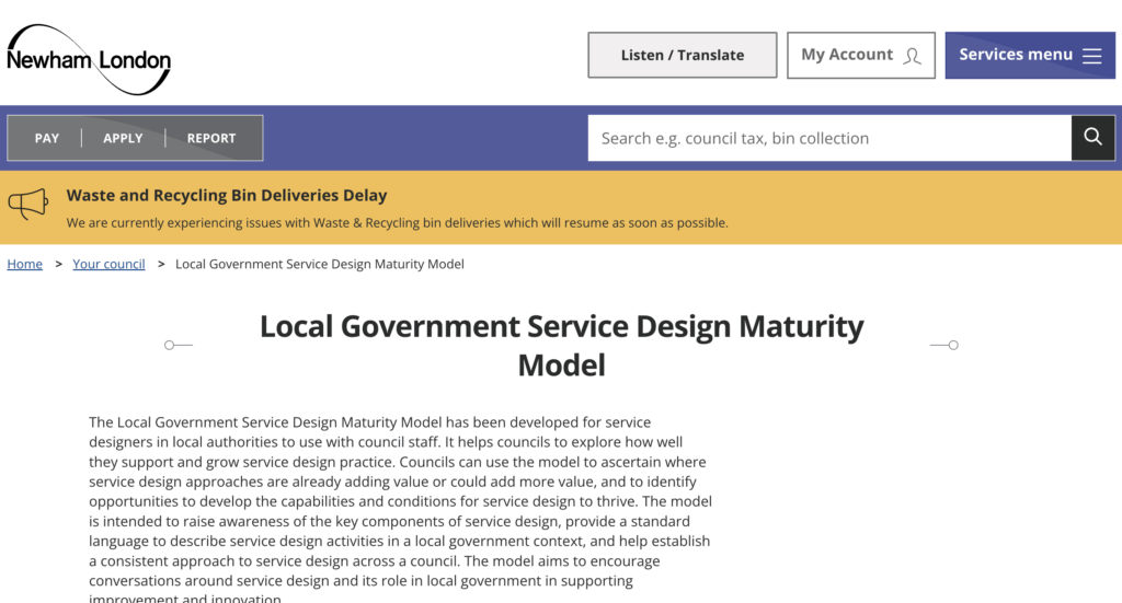 “The Local Government Service Design Maturity Model has been developed for service designers in local authorities to use with council staff. It helps councils to explore how well they support and grow service design practice. Councils can use the model to ascertain where service design approaches are already adding value or could add more value, and to identify opportunities to develop the capabilities and conditions for service design to thrive.”