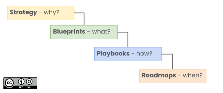 - Blueprints are created individually for different elements of the strategy, such as core ICT, applications, data or online experience. They provide a link between strategy and delivery. They answer the question ‘what?’. They are likely to change as decisions are made around the issues involved.Blueprints are likely to come in a variety of formats. Could be enterprise architecture type diagrams, could be statements of approach, could be policu documents, could be organisation charts. All depends what bits of the mechanisms of strategy delivery you’re articulating.