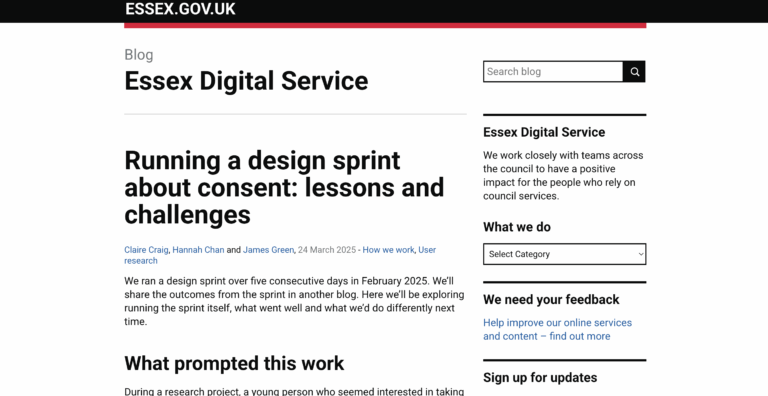 Some great practical experience and advice from the Essex Digital Service on running a design sprint to quickly prototype solutions to a specific problem. An archived PDF of this page can be downloaded if the original is inaccessible.