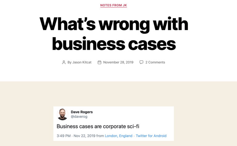 Business cases are lies. Not wilful lies usually, but they end up with the same results: misleading, misinforming and hiding reality. An archived PDF of this page can be downloaded if the original is inaccessible.