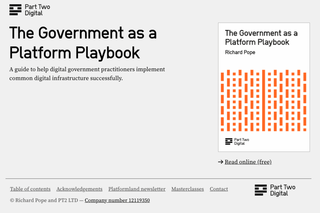 A guide to help digital government practitioners implement common digital infrastructure successfully, written by Richard Pope, the author of Platformland. The PDF linked to is not quite the same as the online content, but is near enough.